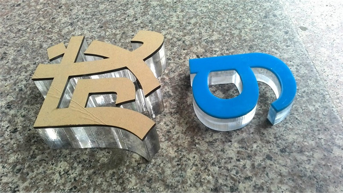 一般是双层的亚克力制作,下面是透明的亚克力(一般厚度有5mm,8mm, 10mm), 面板是3mm厚的带颜色亚克力。采用粘合方法连接在一起,从侧方看有水晶的效果,俗称“水晶字”。