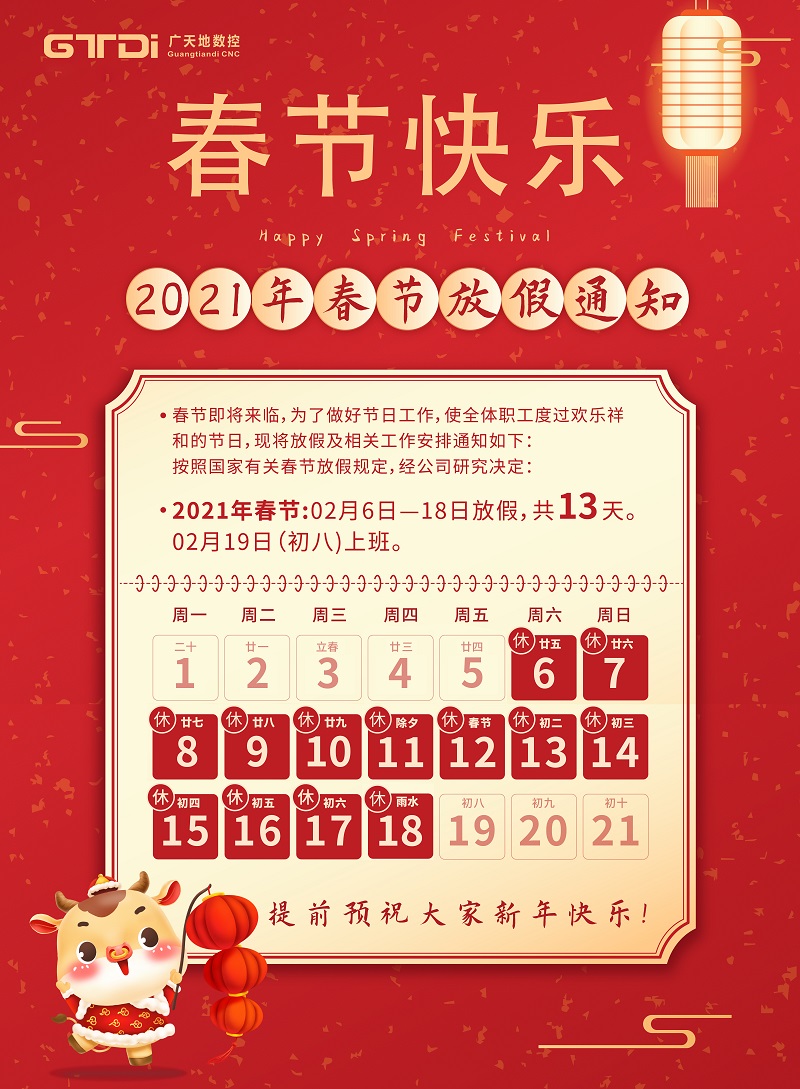 2021年春节将至,首先感谢您在2020年里的鼎力支持和愉快合作,乐鱼数控全体同仁在此给您拜个早年。在新年的一年里,乐鱼将更加努力,为您提供更优质的服务。按照国家春节放假规定结合我司的具体情况,春节放假时间安排如下: