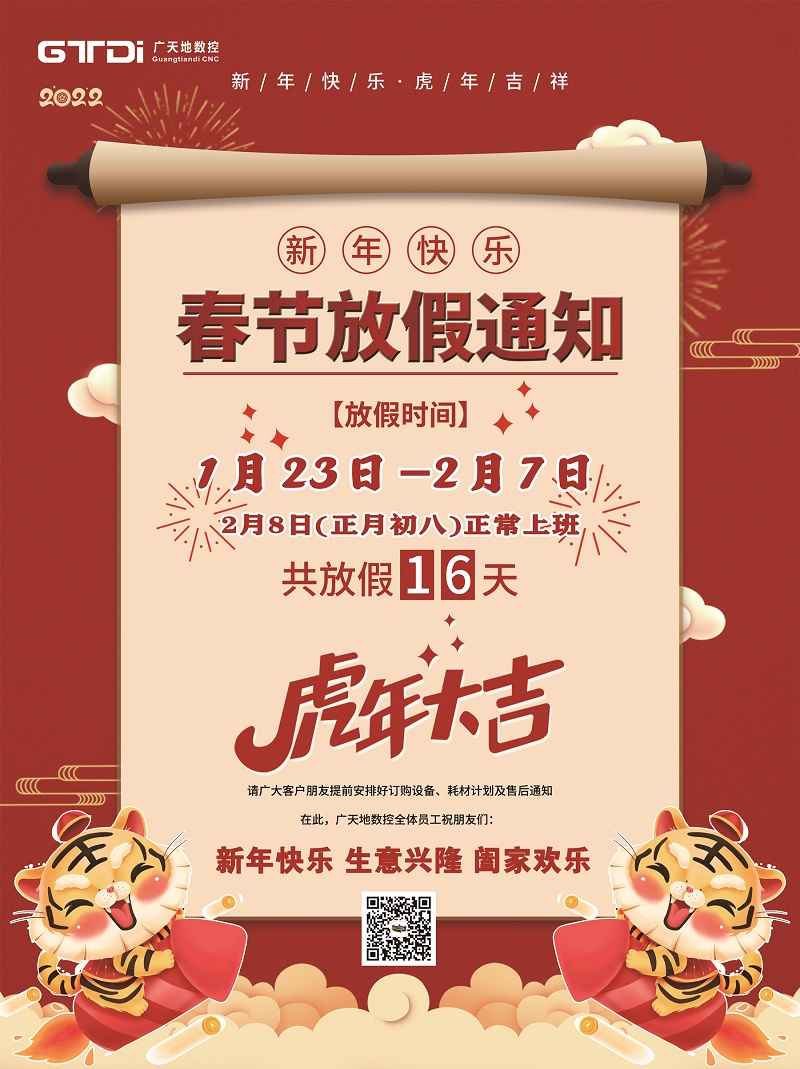 2022年春节将至,首先感谢您在2021年里的鼎力支持和愉快合作,乐鱼数控全体同仁在此给您拜个早年。在新年的一年里,乐鱼将更加努力,为您提供更优质的服务。按照国家春节放假规定结合我司的具体情况,春节放假时间安排如下: