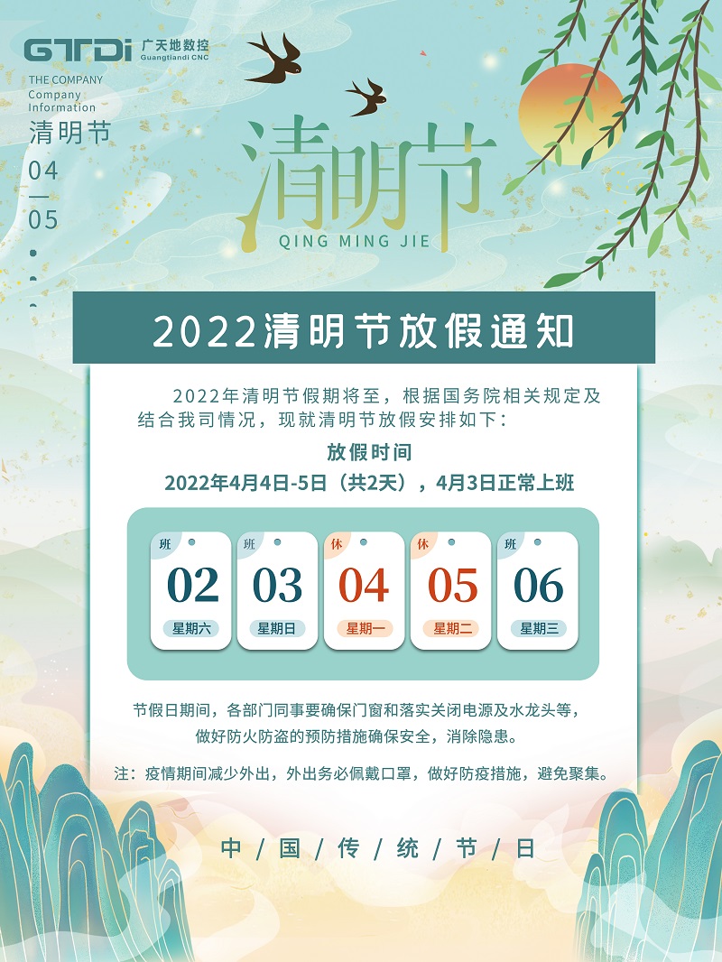 根据国务院办公厅《关于2022年部分节假日安排的通知》,并结合我司实际情况,乐鱼数控2022年清明节放假安排如下: