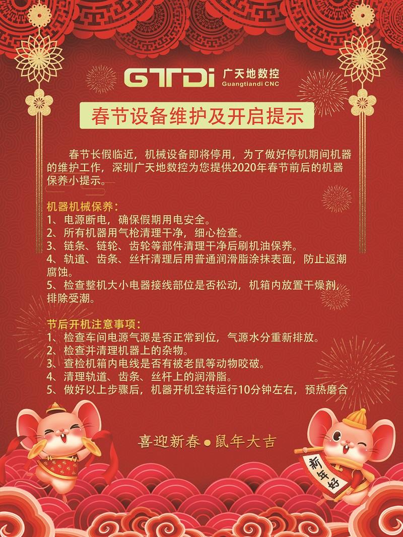 春节长假临近,机械设备即将停用,为了做好停机期间机器的维护工作,深圳乐鱼数控为您提供2020年春节前后的机器保养小提示。